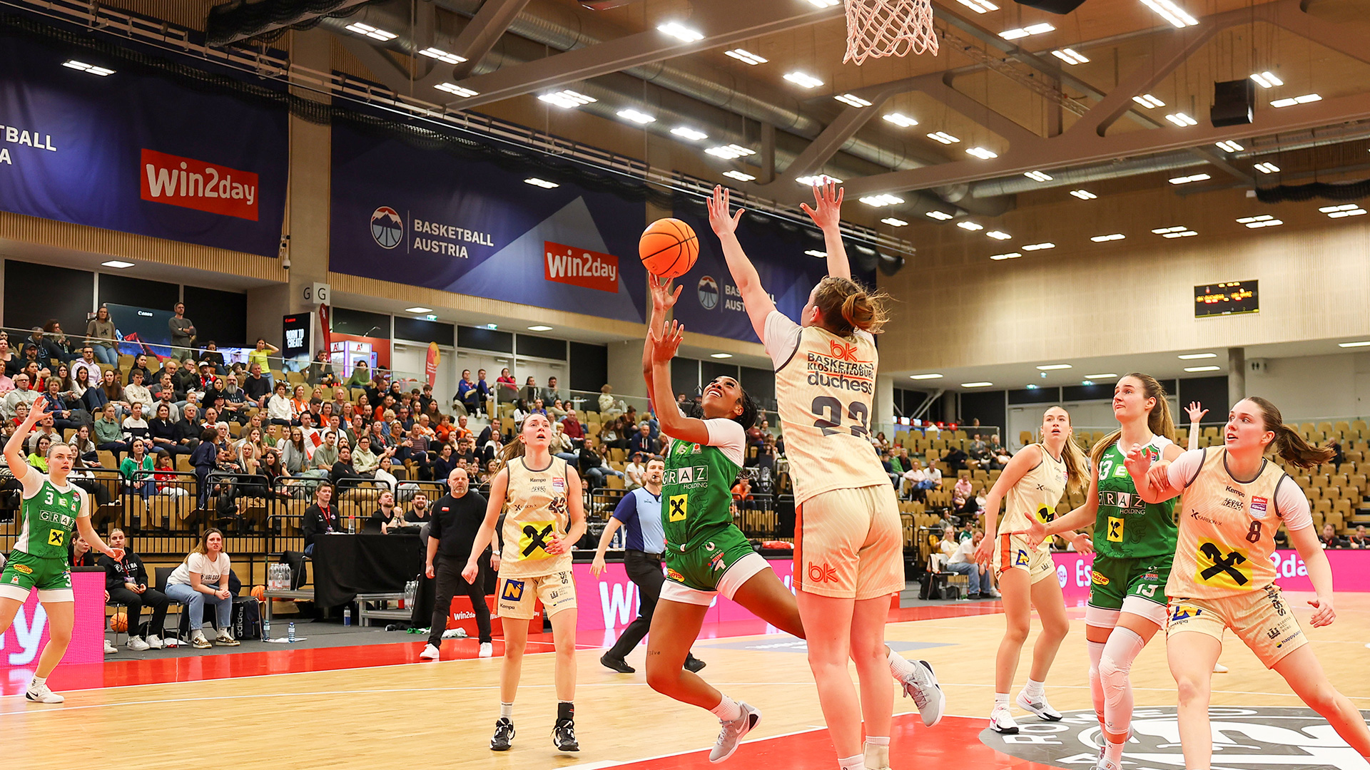 Die erste Finalpaarung bei den diesjährigen Basketball Austria Cup Finals presented by Alfa Romeo ist perfekt. Die BK Raiffeisen Duchess Klosterneuburg siegten im zweiten Semfinale der Damen gegen UBI Holding Graz knapp 83:79 (40:32) und folgten den Basket Flames ins Endspiel (Sonntag, 15:00 Uhr, ORF Sport+). Das Spitzenspiel wurde den hohen Erwartungen gerecht. Die Entscheidung brachten erst zwei verwandelte Freiwürfe von Top-Scorerin Sigrid Koizar (24) 2,2 Sekunden vor dem Ende. Den Grazerinnen genügten 37 Zähler von Neuzugang Jade Hill nicht.